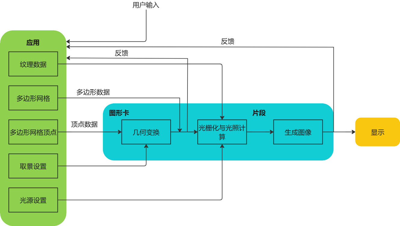 <figure><img src="https://2598871645-files.gitbook.io/~/files/v0/b/gitbook-x-prod.appspot.com/o/spaces%2FGnZr7YN65NX3xHhm28Jq%2Fuploads%2FB62LHutqCamDHKtAMsBo%2Fimage.png?alt=media&#x26;token=6eee71f0-78d9-42e2-b882-eb93e31824cf" alt=""><figcaption><p>图形管线主要包括4个部分: 顶点几何处理和变换，三角形的处理和片段生成，纹理映射和光照以及用来组装最终图像的片段组合操作</p></figcaption></figure>